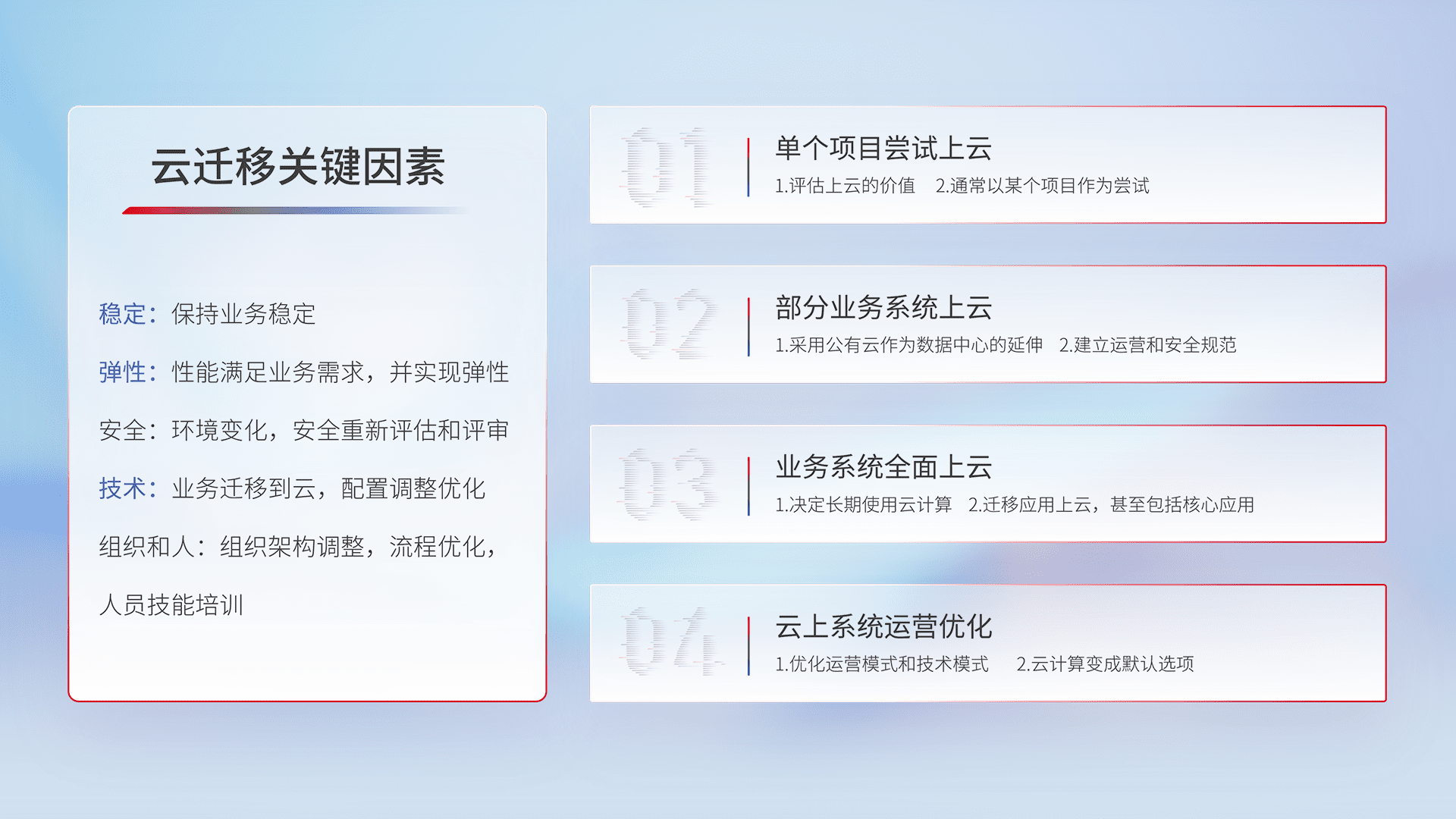 结合实际业务,,,,从规划设计、、云平台选型、、、、云原生改造、、、、数据迁移、、集成交付,,迁移全过程为客户识别最佳上云路径,,做好风险识别管理,,,,设计网络架构、、身份权限、、、、安全审计合规、、、操作审计、、、日志审计、、、监控告警策略、、、、多站点容灾设计等,,对云上基础设施进行整体规划,,,提升IT治理水平,,,以满足弹性、、、、高可用、、高性能的需求。。