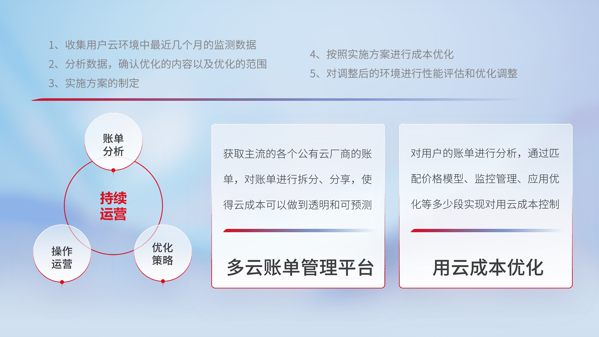 通过多云纳管,,,以统一的资源数据模型把客户的云资源进行抽象和封装,,,进而实现对多云资源的统一操作,,保障云资源管理的可靠性、、稳定性与可用性。。量身定制化运维内容,,,配置、、、开发运维、、补丁管理、、、、备份、、、、监控、、、、认证和访问管理、、、审计和日常巡检等,,,保障在用云过程中的可靠度,,,稳定度以及高可用率。。。。